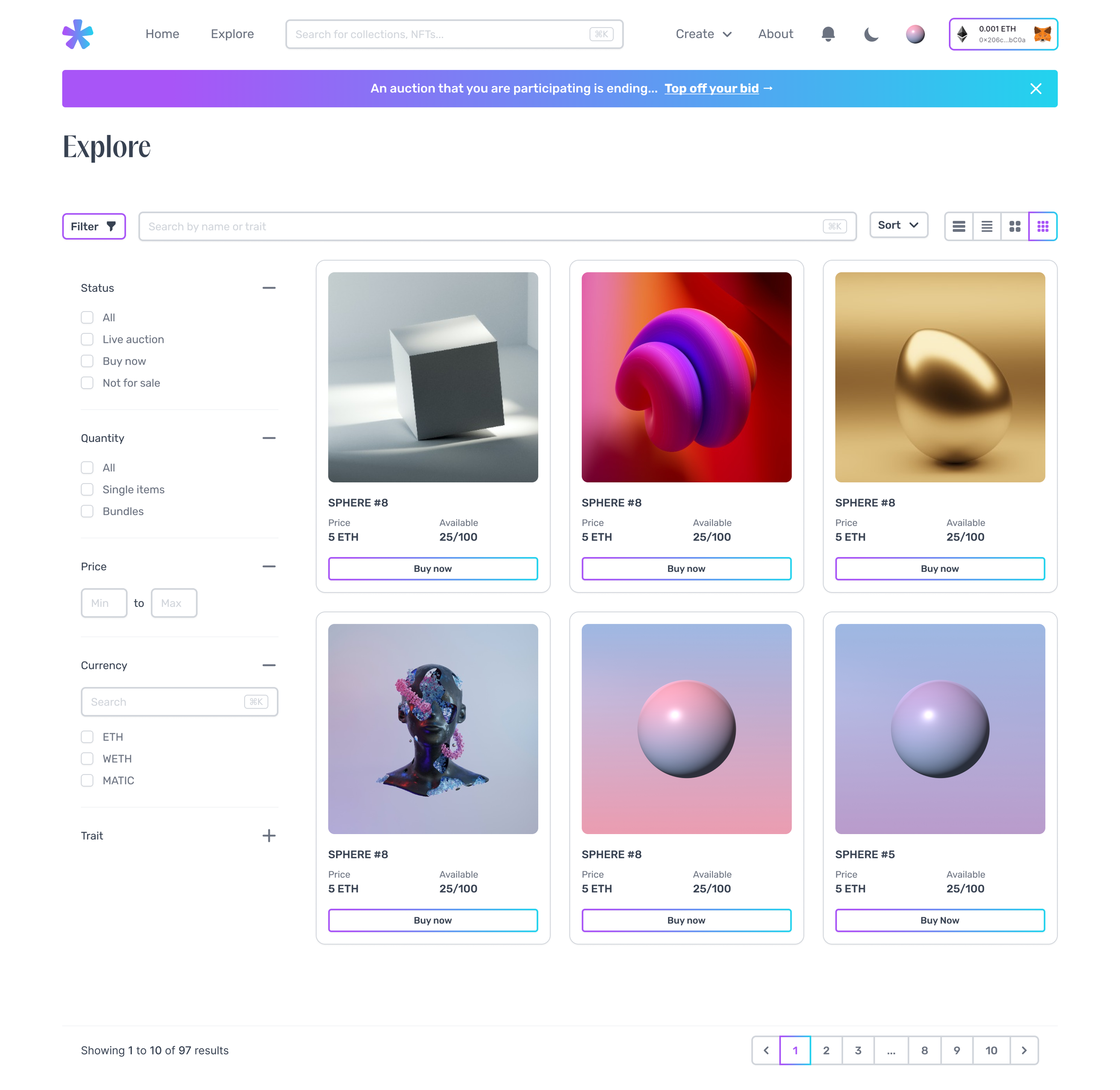 Regarding the visual design of the white-label NFT marketplace, we wanted to make it funky, modern and acceptable for both the artists that would mint the artworks, and for the buyers.